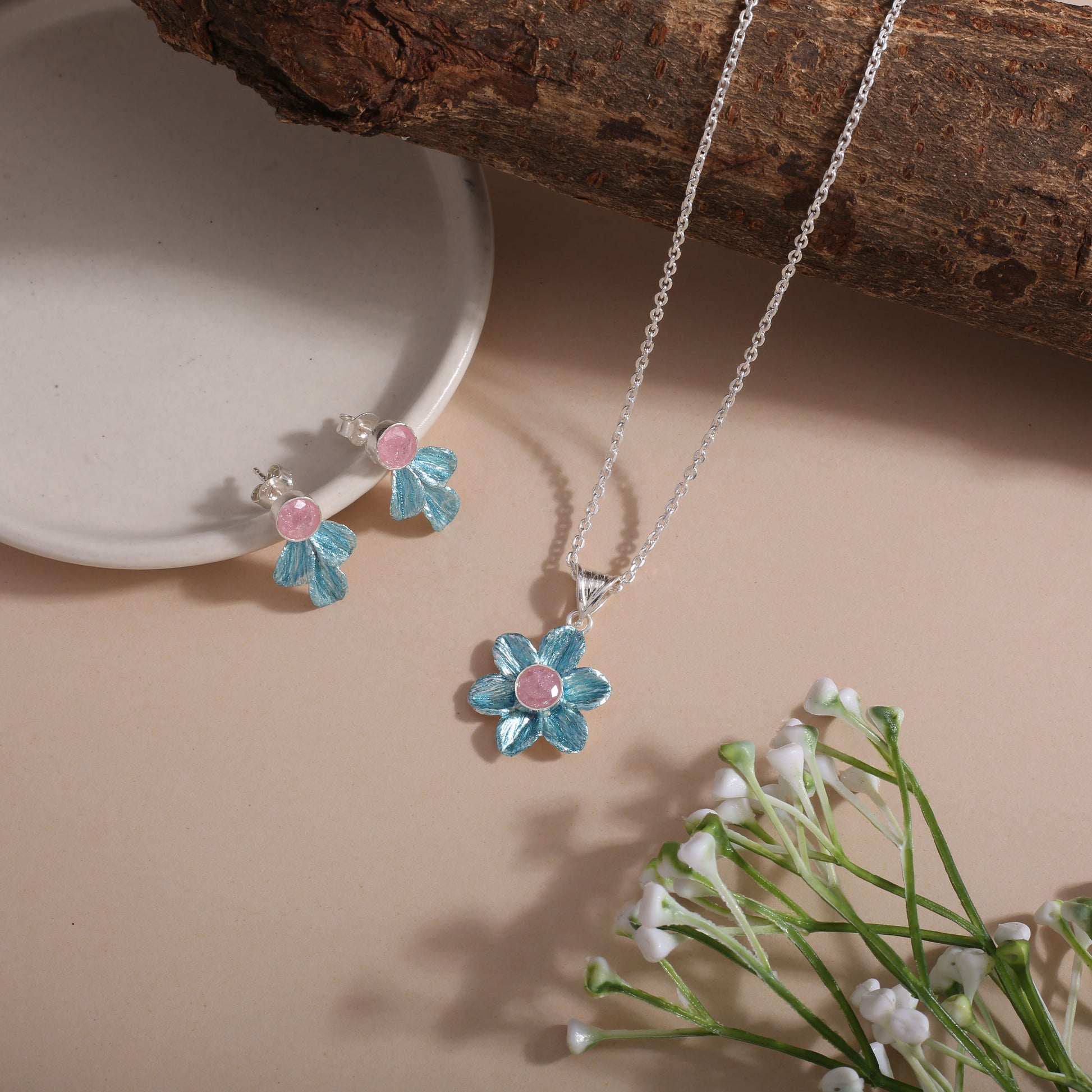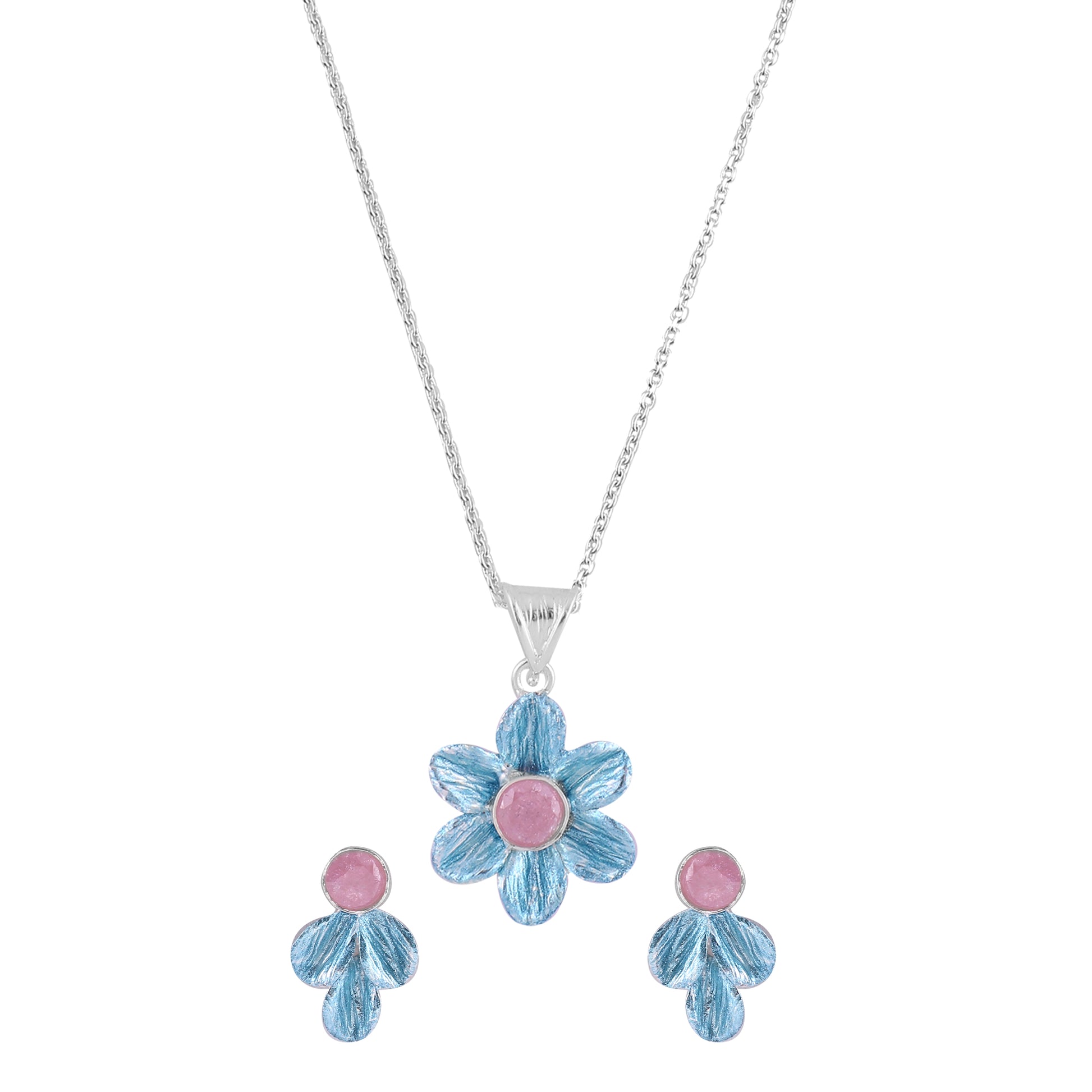 Gross Weight: 9.500 Grams. Features a Bluish Colour Rhodium Flower Pendant with Matching Tops, Creating a Fresh and Graceful Floral Aesthetic.