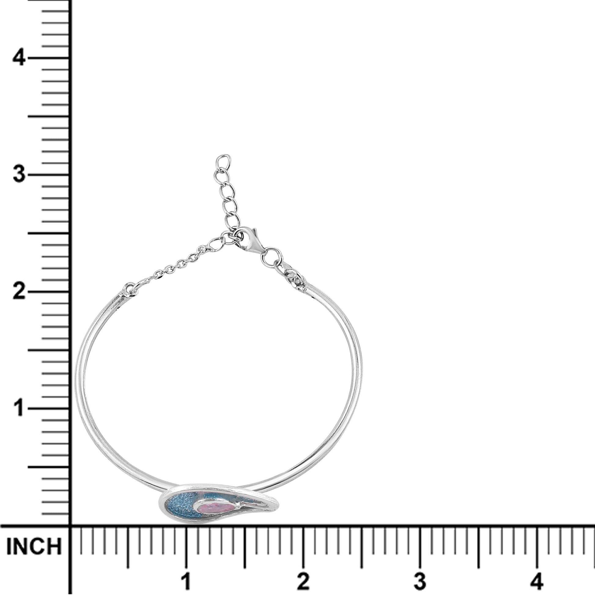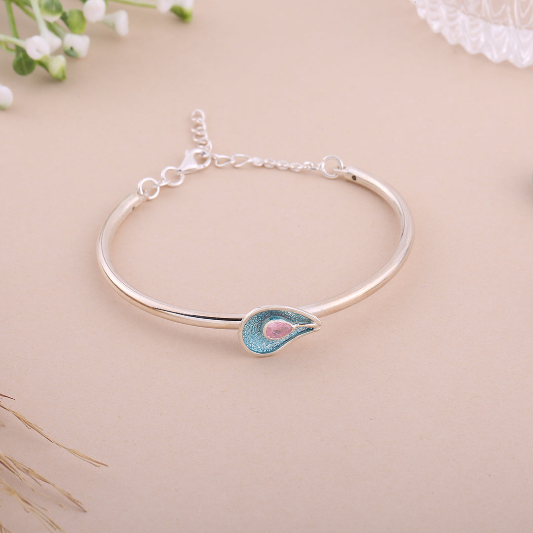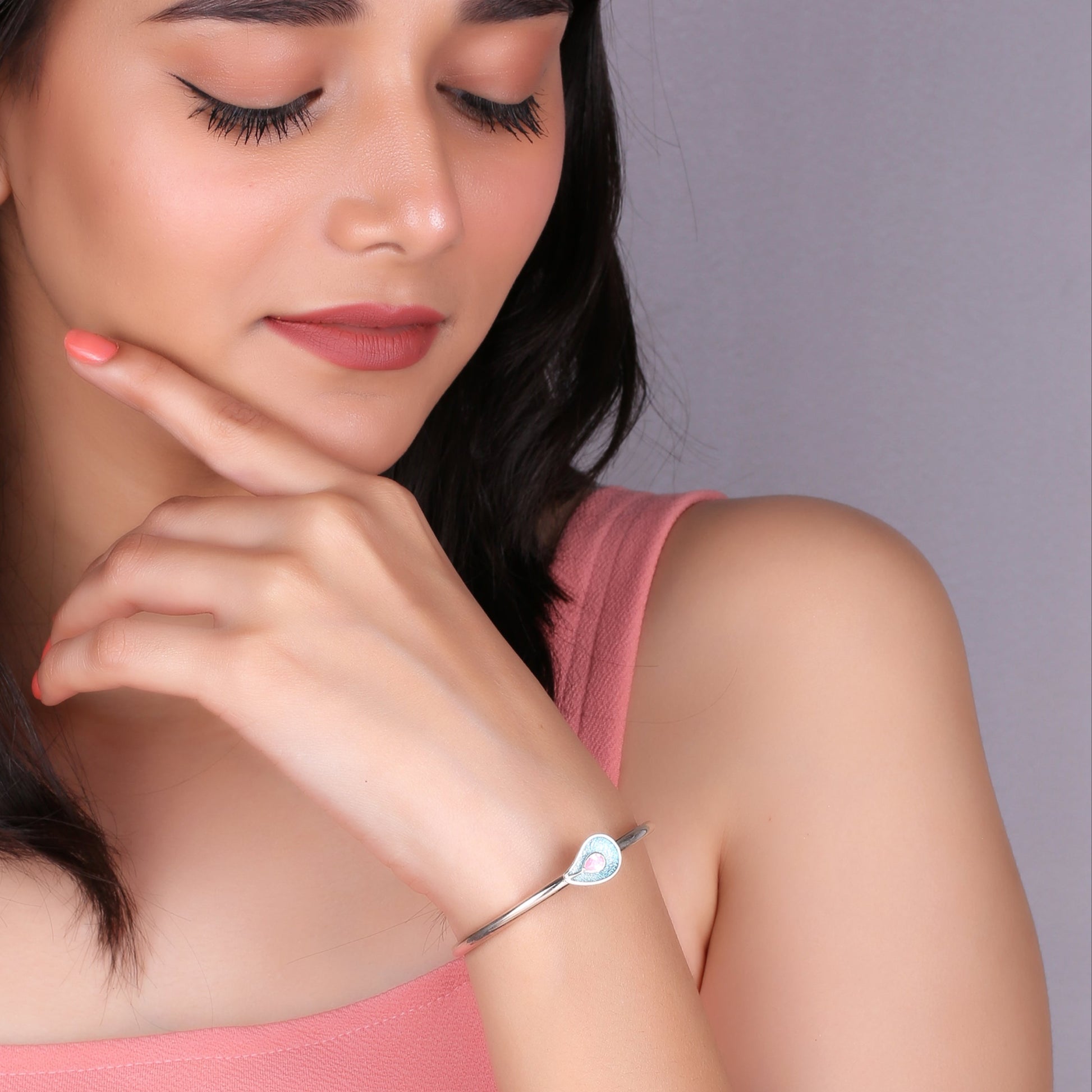 Inspired by timeless elegance and graceful design, The Aqua Drop Bracelet is a true embodiment of sophistication. This bracelet features a delicately crafted silver band adorned with a beautifully textured paisley-shaped charm. The charm showcases a vibrant blue enamel backdrop that shimmers in the light, encasing a soft pink teardrop shaped stone at its centre adding a perfect pop of colour and contrast.