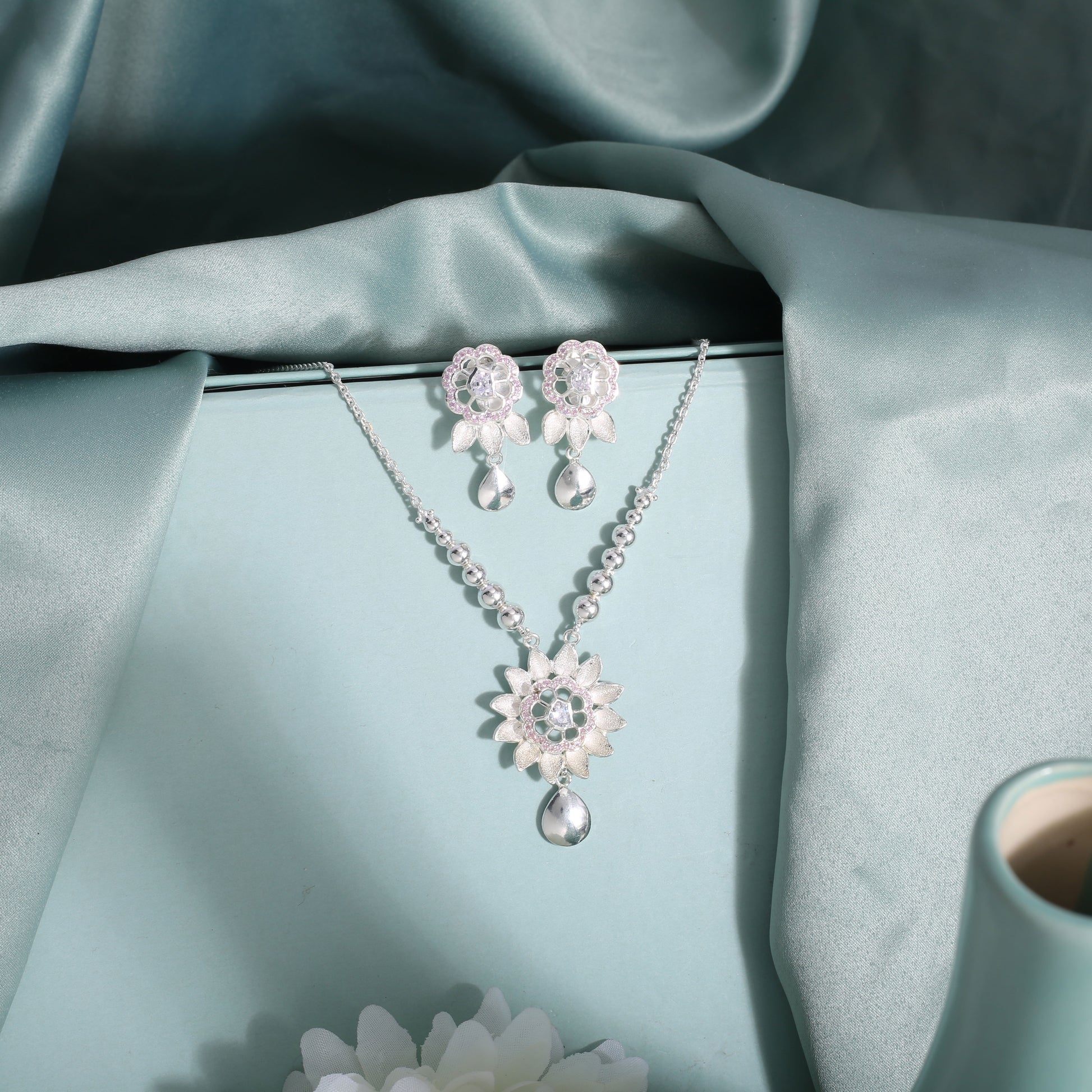 This Elegant Necklace Set Includes a Pendant, Earrings, and a 15-Inch Chain with a 2.5-Inch Adjustable Lock. Handcrafted in Pure 925% Silver and Made in India, Each Piece Highlights Fine Craftsmanship and a Refined Aesthetic. Every Design is Well Stamped with 925 Silver and SITARA, Offering Authenticity and Premium Quality. Suitable for Both Party Wear and Casual Wear, Presenting a Simple yet Stylish Look. Skin-Friendly and Finished with Lifetime Plating for Long-Lasting Shine.