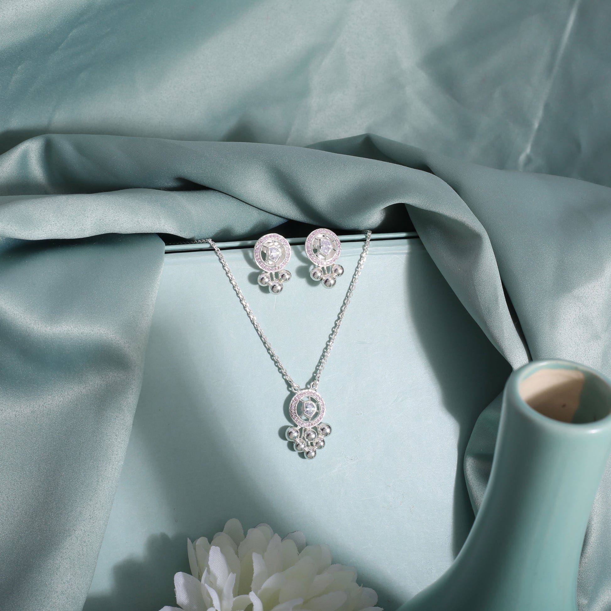 This Elegant Necklace Set Includes a Pendant, Earrings, and a 15-Inch Chain with a 2.5-Inch Adjustable Lock. Handcrafted in Pure 925% Silver and Made in India, Each Piece Showcases Artful Craftsmanship and a Sophisticated Finish. Every Design is Well Stamped with 925 Silver and SITARA, Representing Authenticity and Lasting Quality. Perfect for Both Party Wear and Casual Wear, Offering a Simple yet Stylish Look. Skin-Friendly and Finished with Lifetime Plating for Enduring Shine.