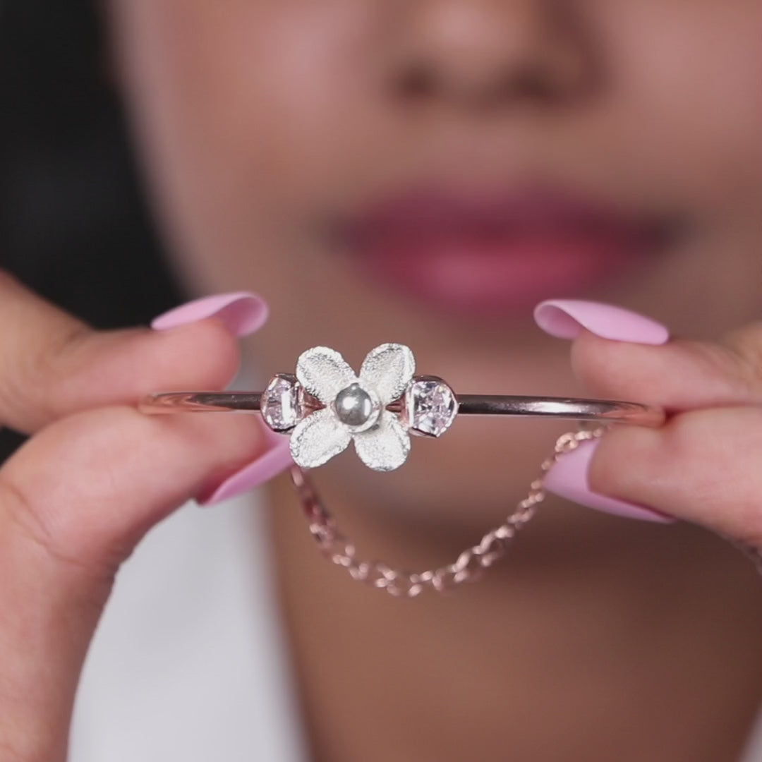Embrace timeless beauty and floral elegance with this Rose Gold & Silver Flower Uncut Stone Bracelet, a piece that radiates charm and sophistication!