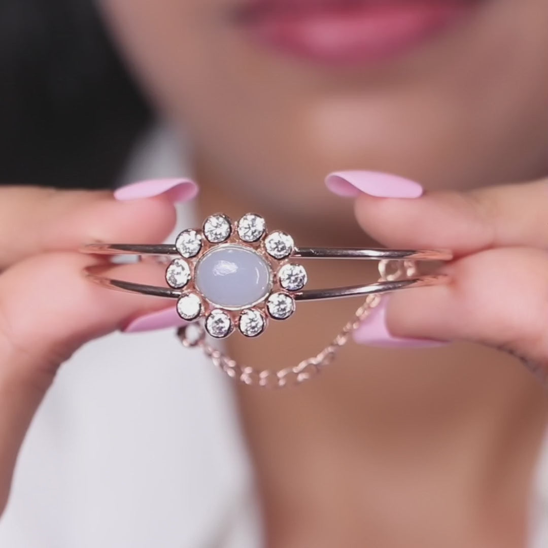Introducing the Rose Gold Moonlight Blue Bracelet, a stunning fusion of elegance and celestial beauty. Featuring a radiant moonlight blue gemstone at its center, this bracelet is designed with a delicate rose gold band that beautifully complements the soft glow of the gemstone. The moonlight blue stone is encircled by a subtle halo of sparkling crystals, adding a touch of enchantment and sophistication to this exquisite piece.