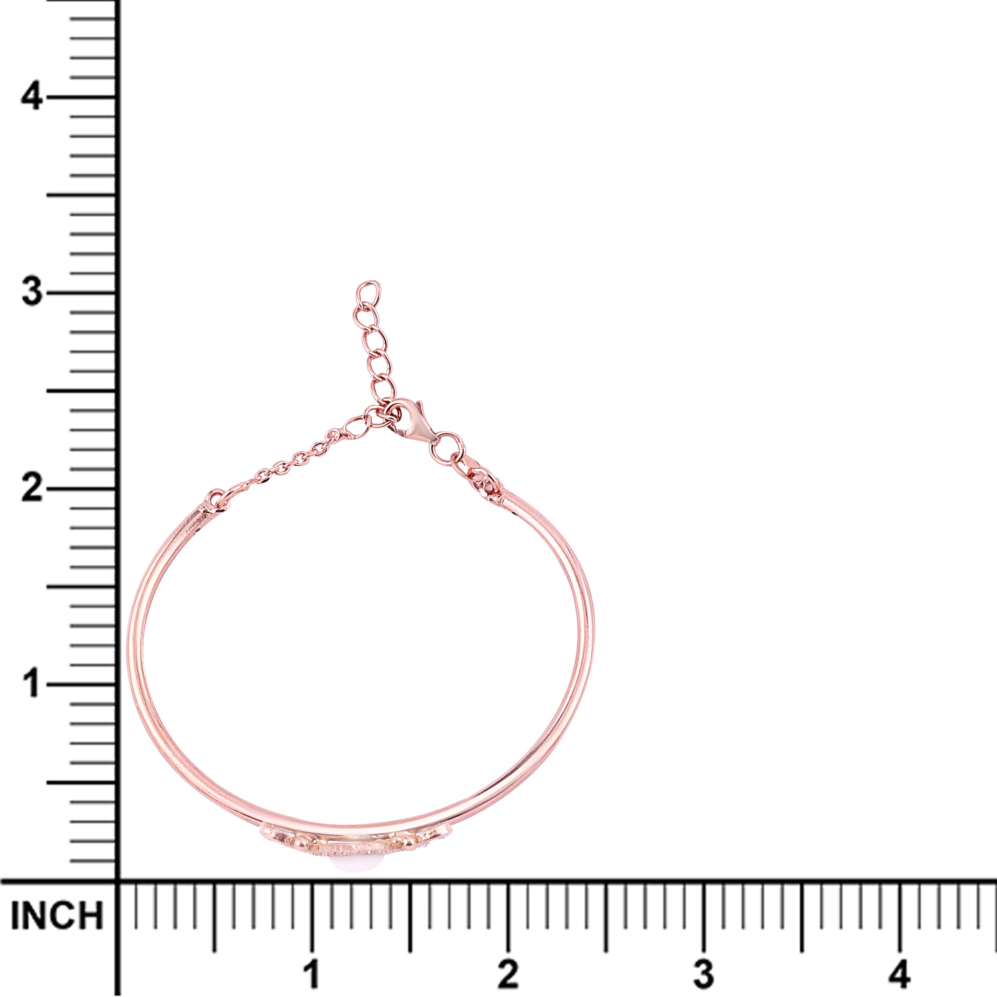 Elevate your elegance with this stunning Rose Gold Pearl White Bracelet, a perfect blend of sophistication and charm. Designed with a sleek rose gold-plated band, this bracelet features a dazzling diamond-shaped centerpiece adorned with shimmering cubic zirconia and a luminous pearl-white inlay. The refined open bangle design is complemented by two brilliant oval-cut stones, adding a touch of sparkle to your wrist.