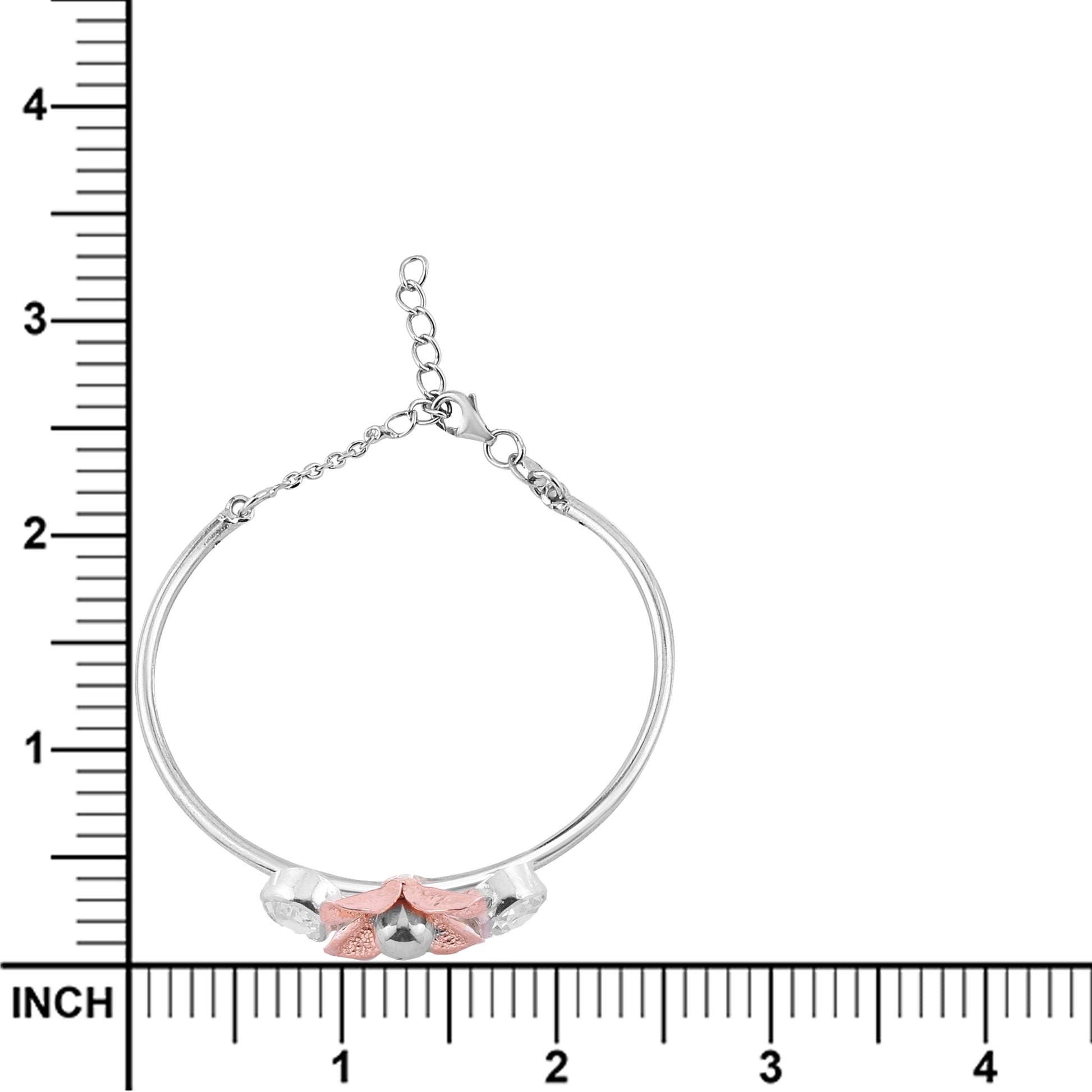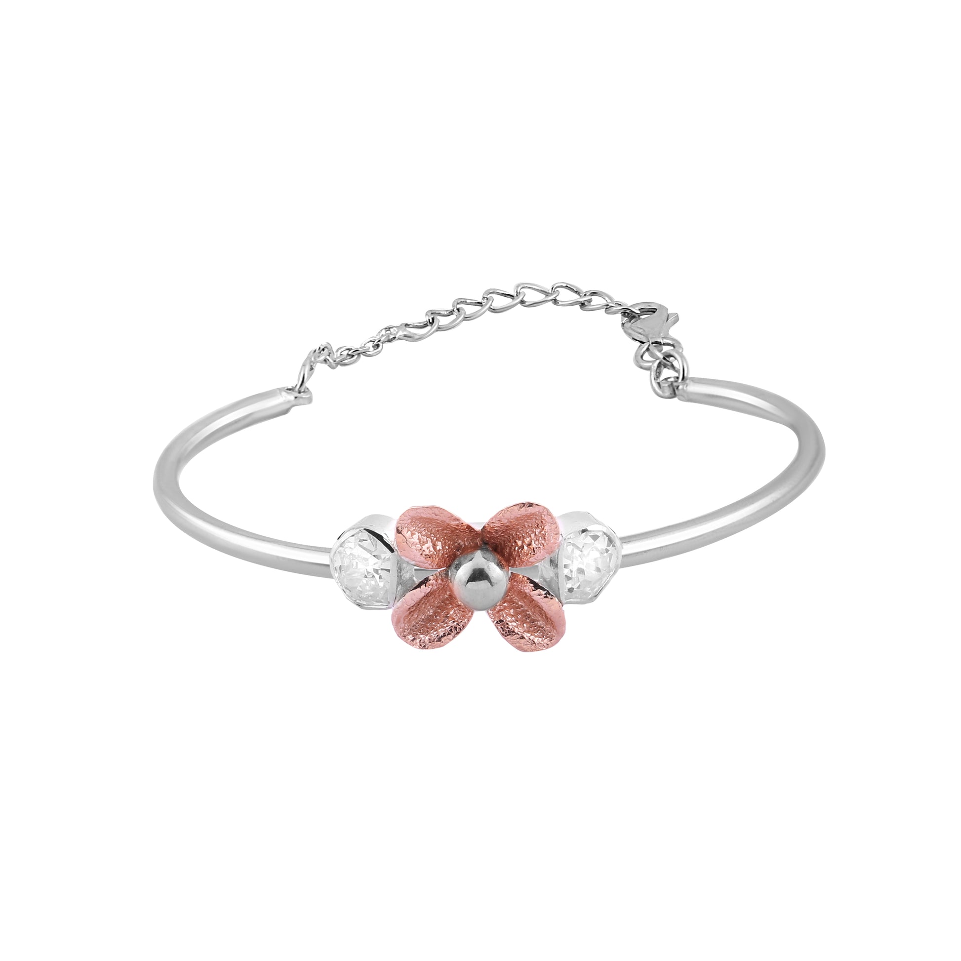 Where simplicity meets elegance in the most charming way. This bracelet features a softly sculpted rose gold flower nestled between two crystal clear stones, all gracefully arranged on a sleek silver band.