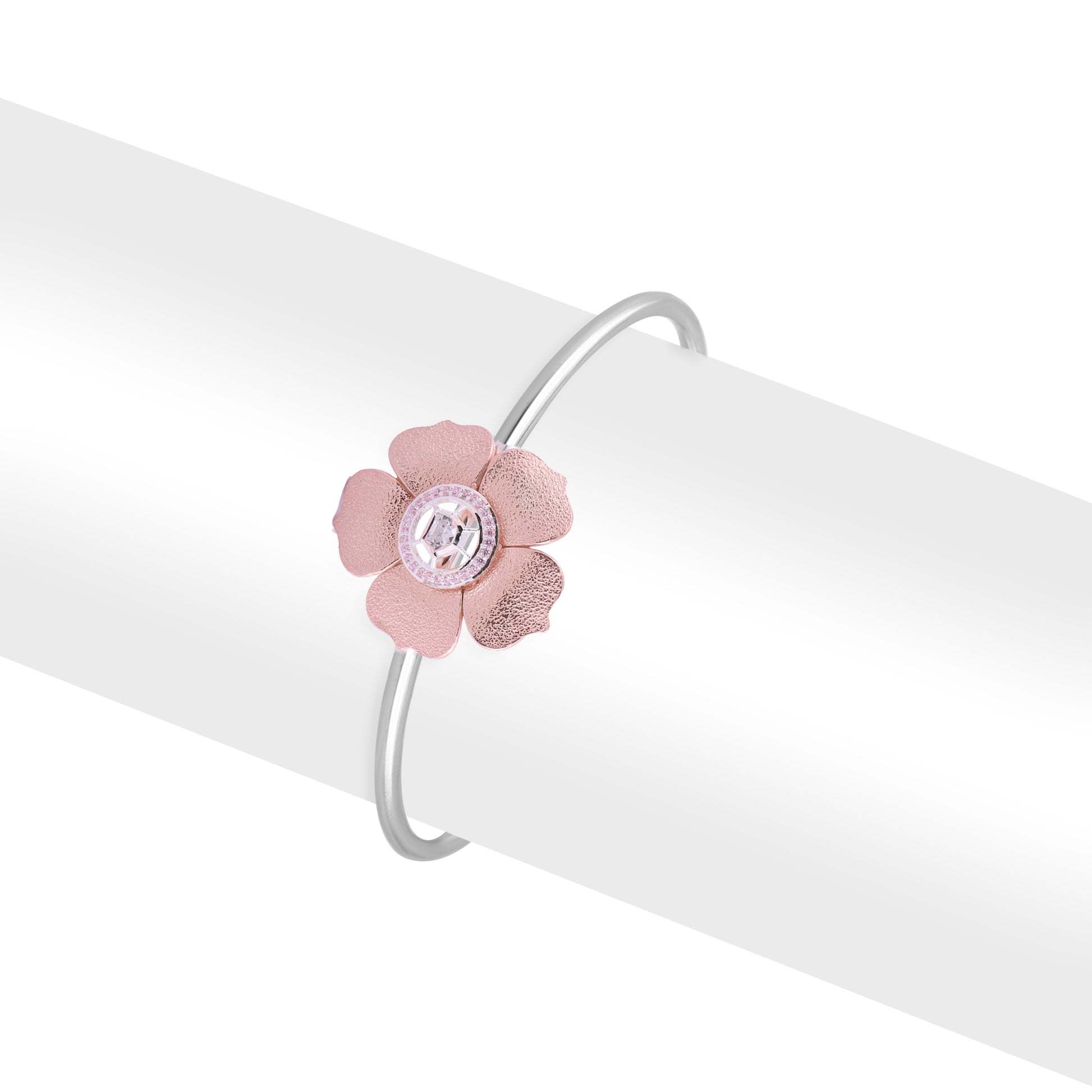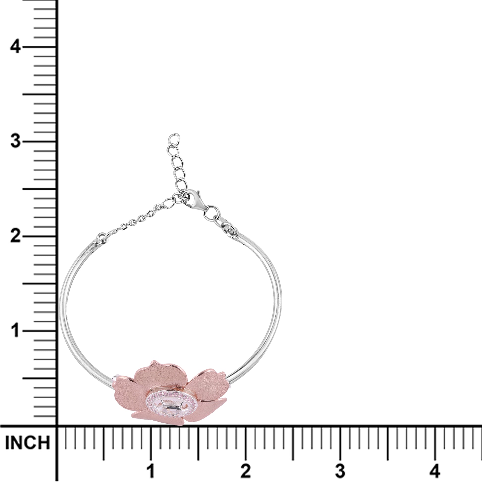 A fusion of elegance and nature, this bracelet features a beautiful rose gold toned flower with a sparkling crystal at its center. Set on a smooth silver band, it is perfect for adding a touch of charm to any outfit. Ideal for both casual and formal wear, this bracelet blends modern style with timeless beauty. Light, adjustable, and perfect for everyday wear or special occasions.