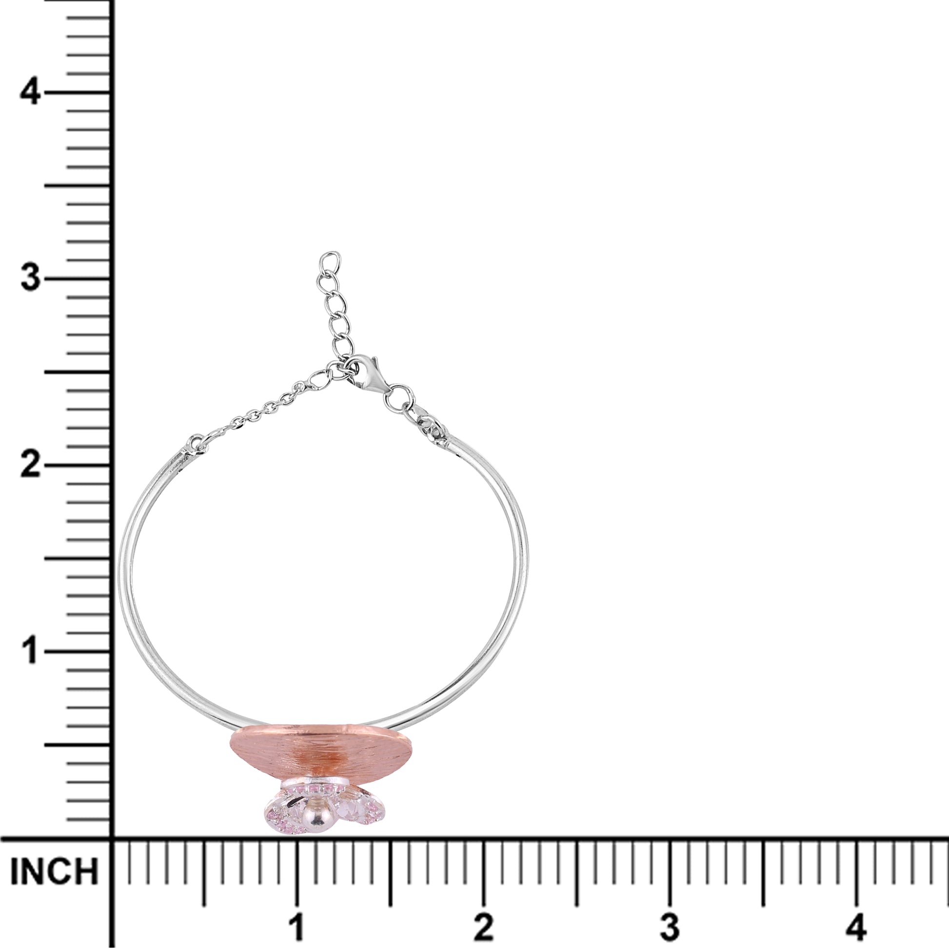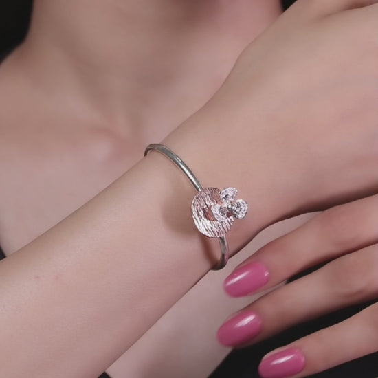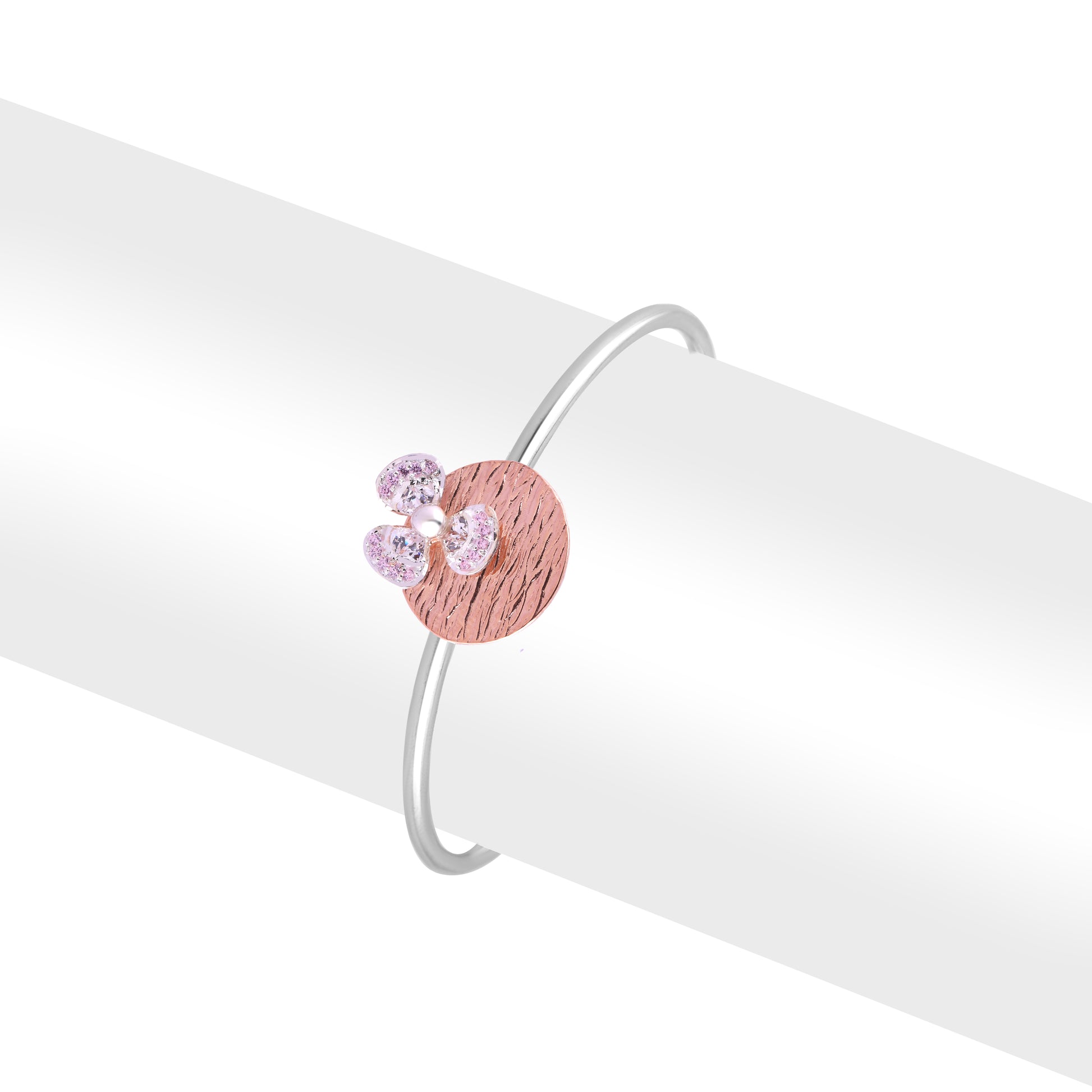 Bring a touch of nature’s charm to your look with this elegant silver bracelet, featuring a beautifully textured rose gold disc at its centre. Adorned with delicate floral petals encrusted in shimmering crystals, this piece captures the subtle beauty of blooming flowers. Its soft yet striking design makes it a versatile accessory, ideal for both everyday elegance and special occasions. The adjustable clasp ensures a secure and comfortable fit for all wrist sizes.