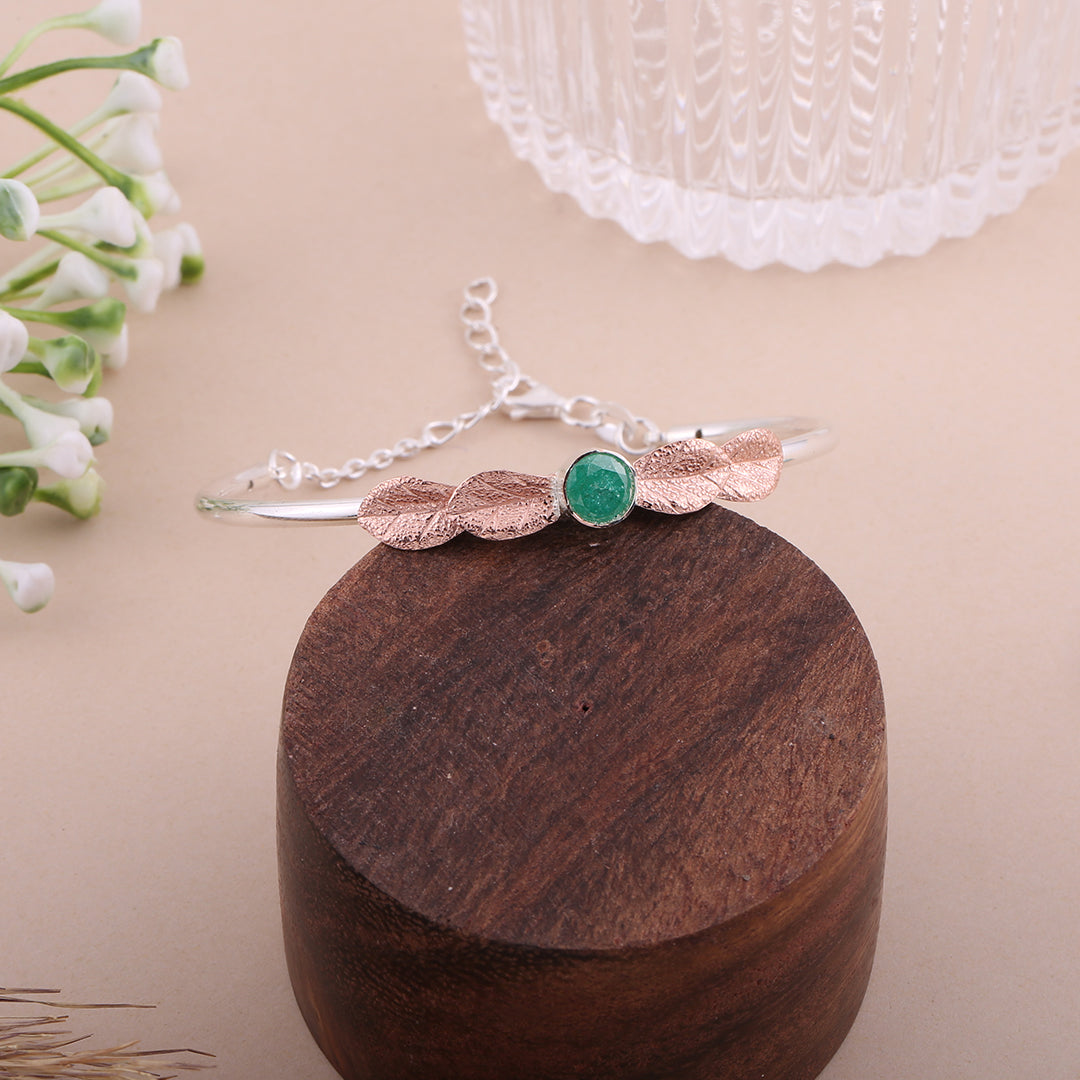 Channel the beauty of nature with the Leaf Whisper Bracelet. This unique piece features a trio of textured rose gold leaves gently embracing a lush green stone at its centre. The silver band adds a sleek contrast, making this bracelet feel both organic and modern. Whether you're connecting with your roots or dressing for a special moment, this bracelet brings grounded elegance to your wrist.