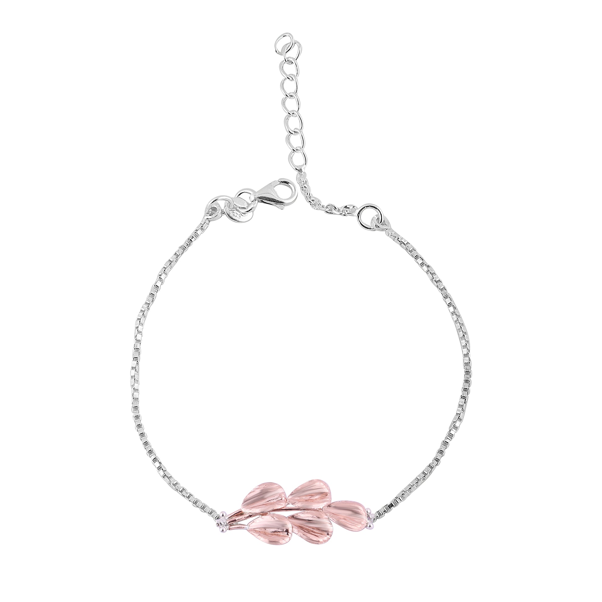 A timeless piece that captures the essence of nature’s grace. Designed with a delicate arrangement of polished rose gold leaves, this bracelet evokes the gentle beauty of falling petals kissed by sunlight. Each leaf is finely sculpted, catching the light with soft, golden warmth, creating a beautiful contrast against its sleek silver chain.