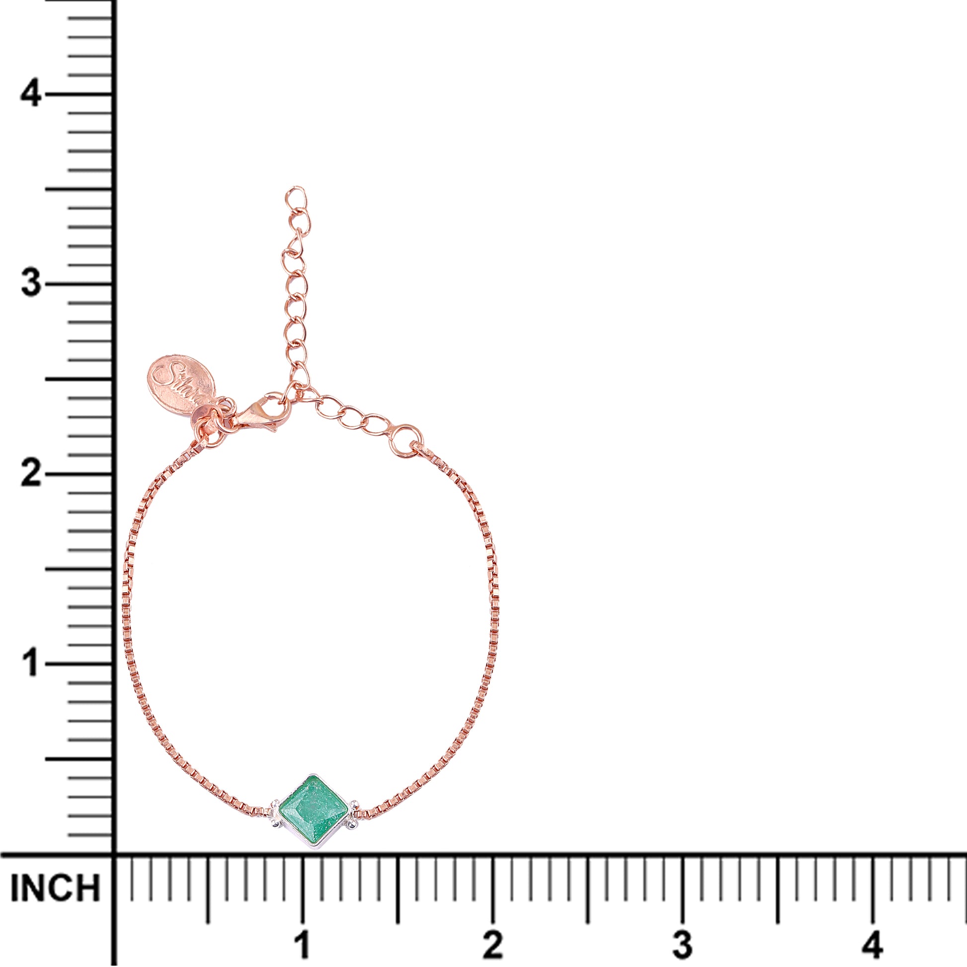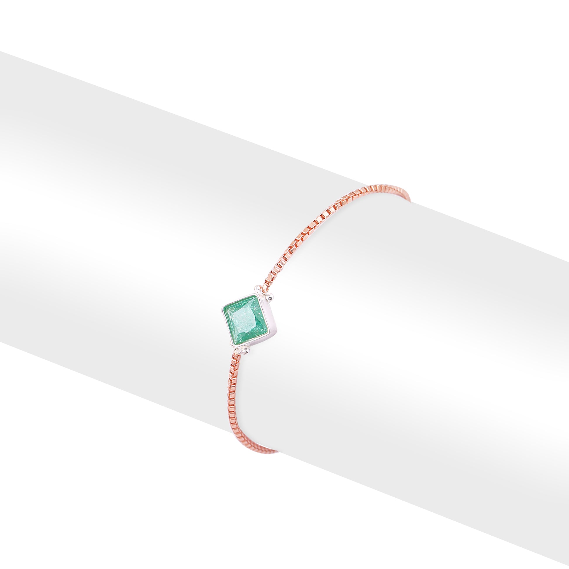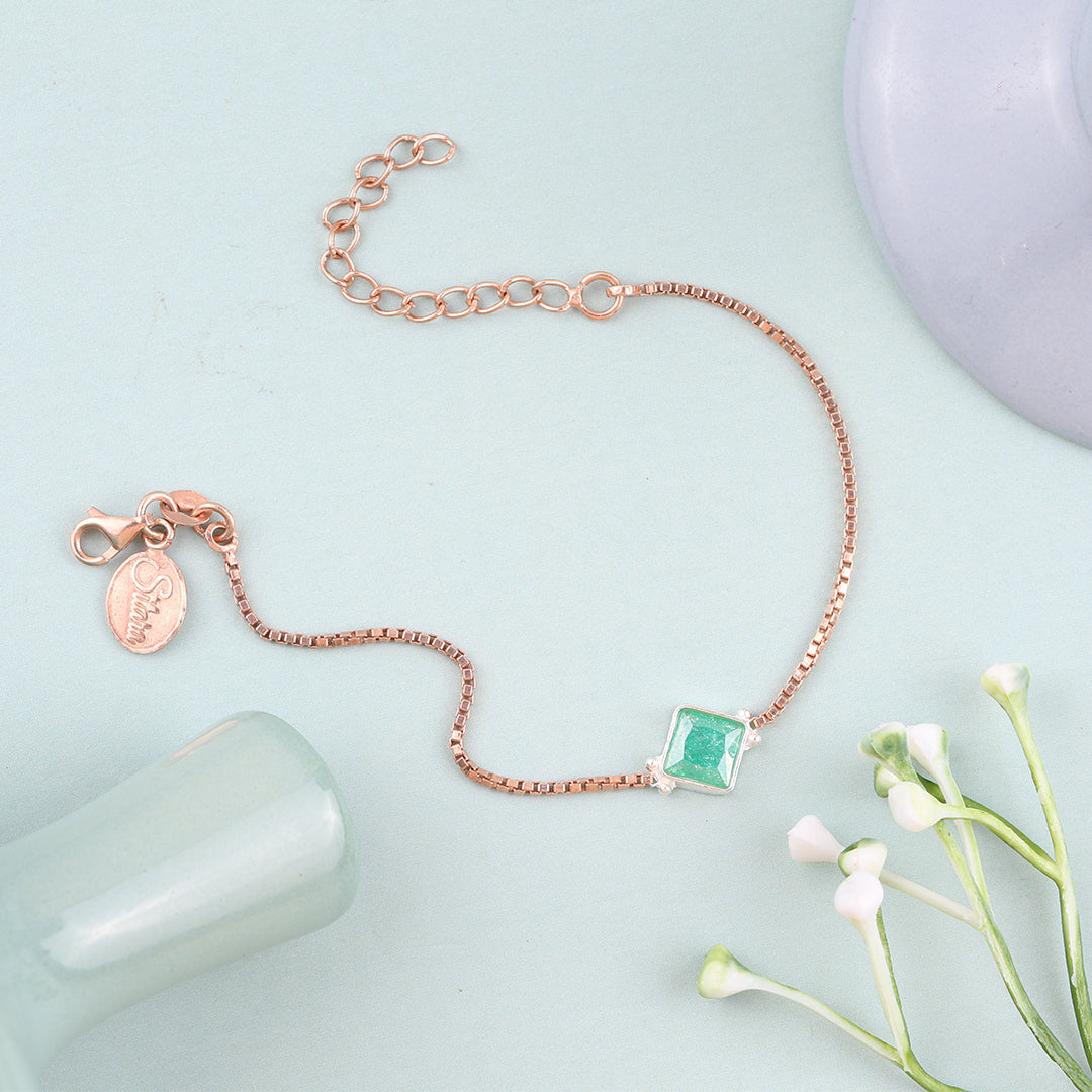 A statement in minimalism with a dash of bold elegance. At the centre of this dainty piece lies a captivating emerald green square stone, framed in a delicate metallic setting and paired with a fine chain that hugs the wrist with understated grace.