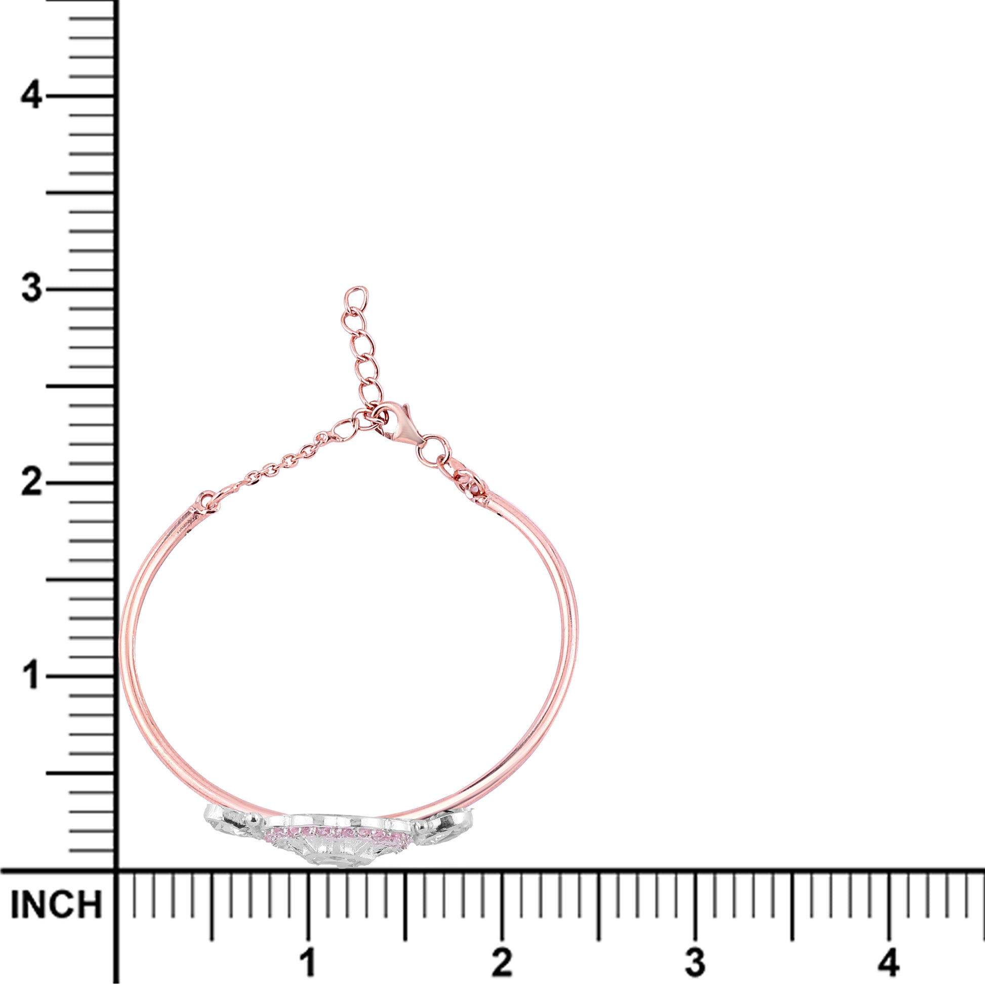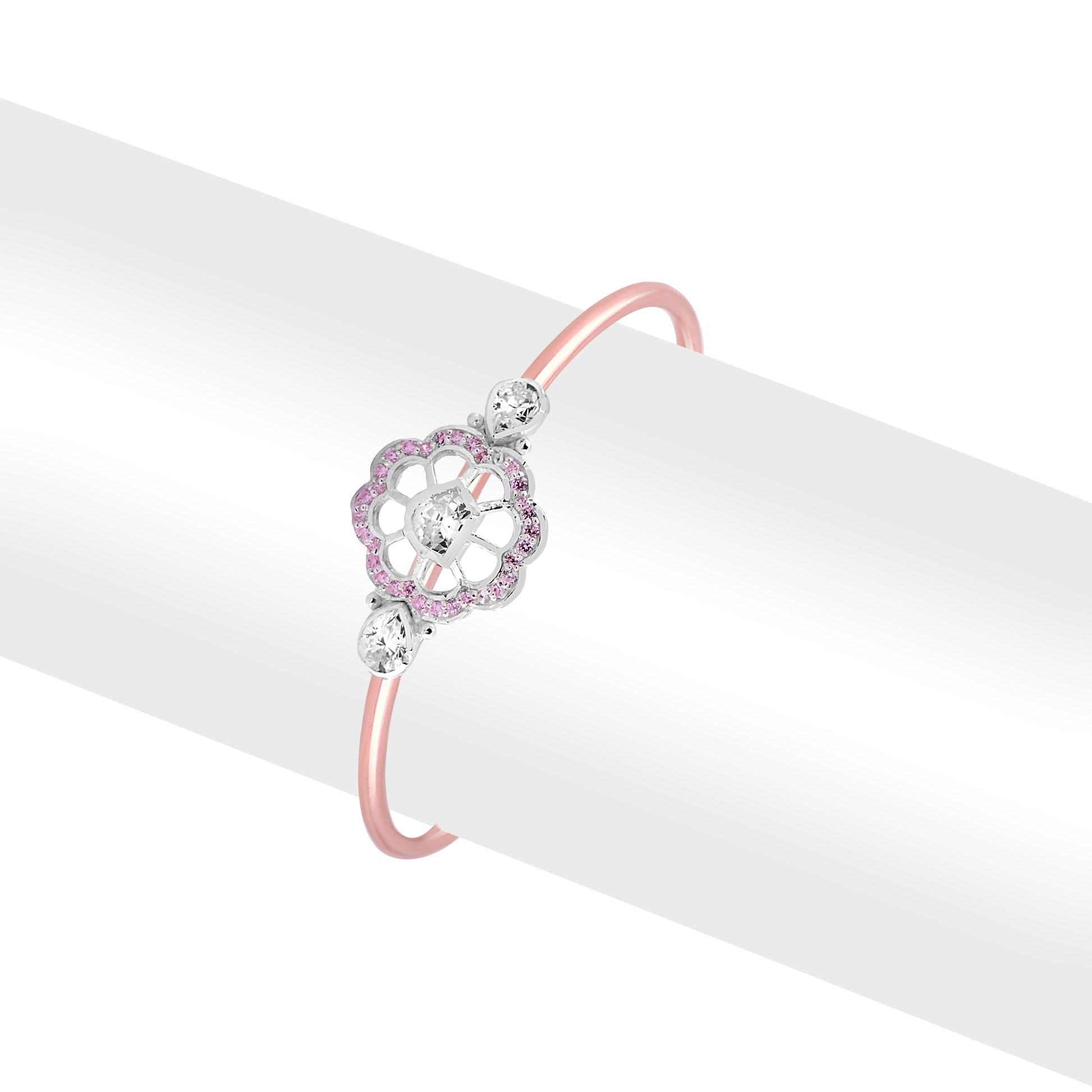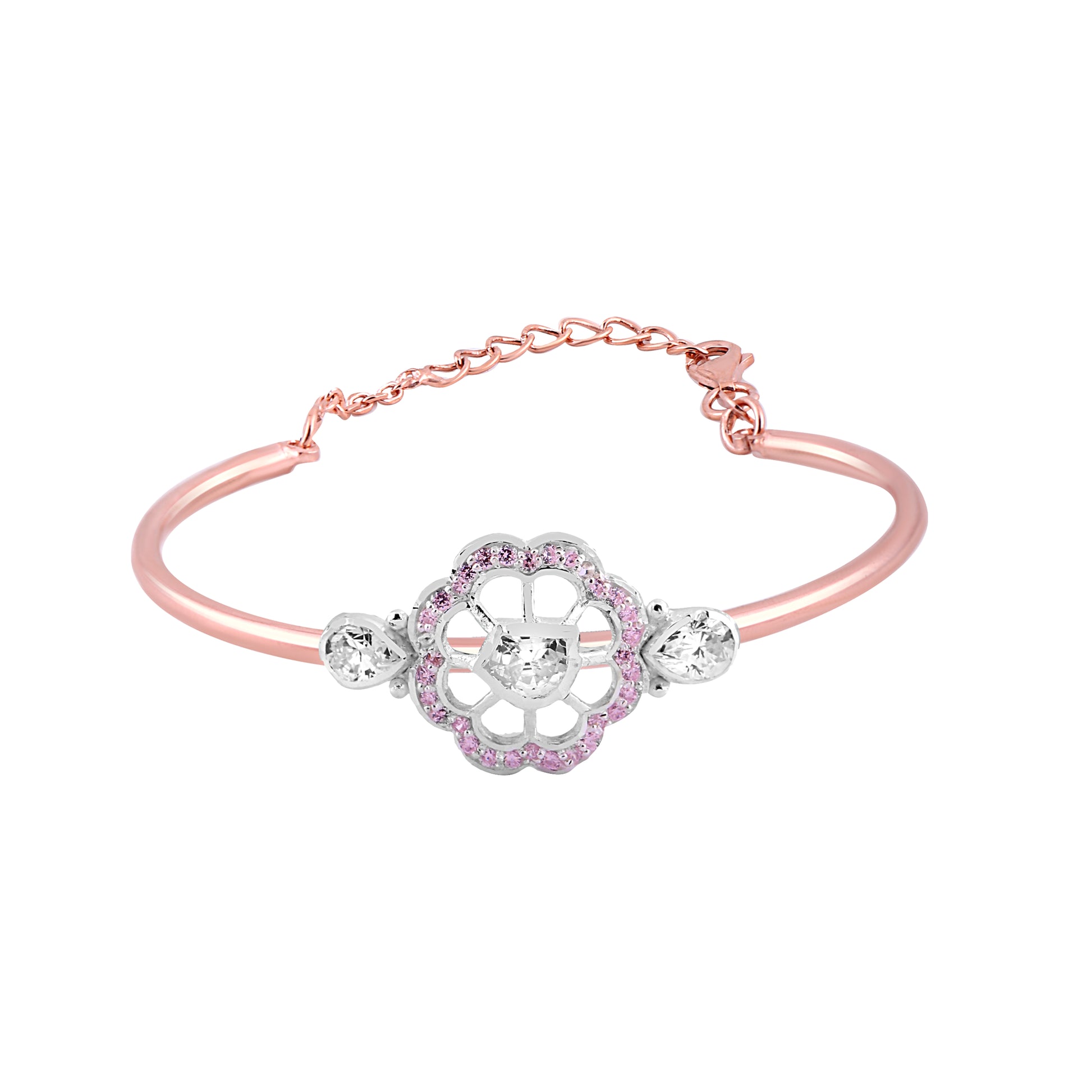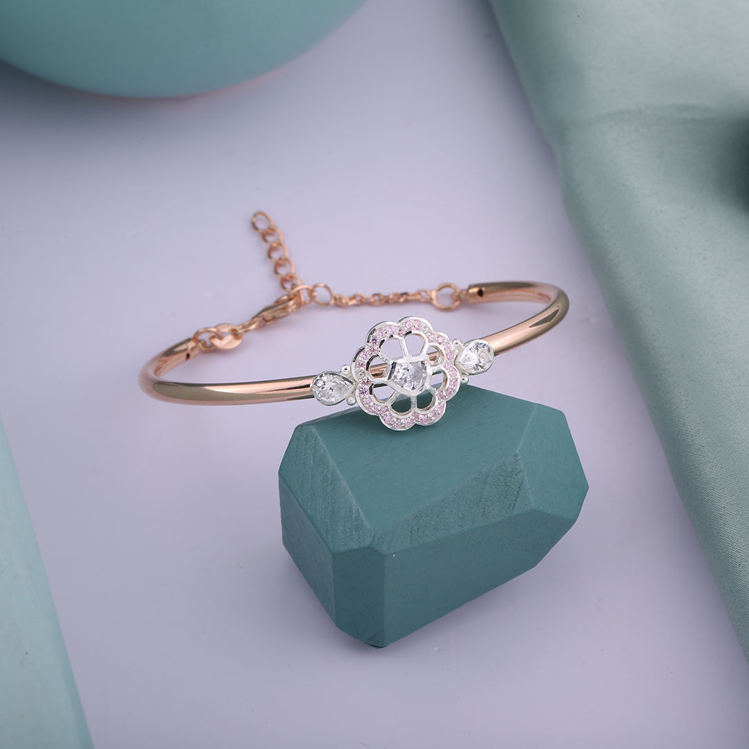 Delicate, graceful, and undeniably charming this rose gold bracelet is made to steal hearts. The centerpiece features a beautifully crafted floral motif, adorned with sparkling white stones and a subtle halo of blush pink gems that add just the right touch of femininity. The sleek, polished band hugs the wrist gently, while the adjustable chain ensures a perfect fit for every occasion.