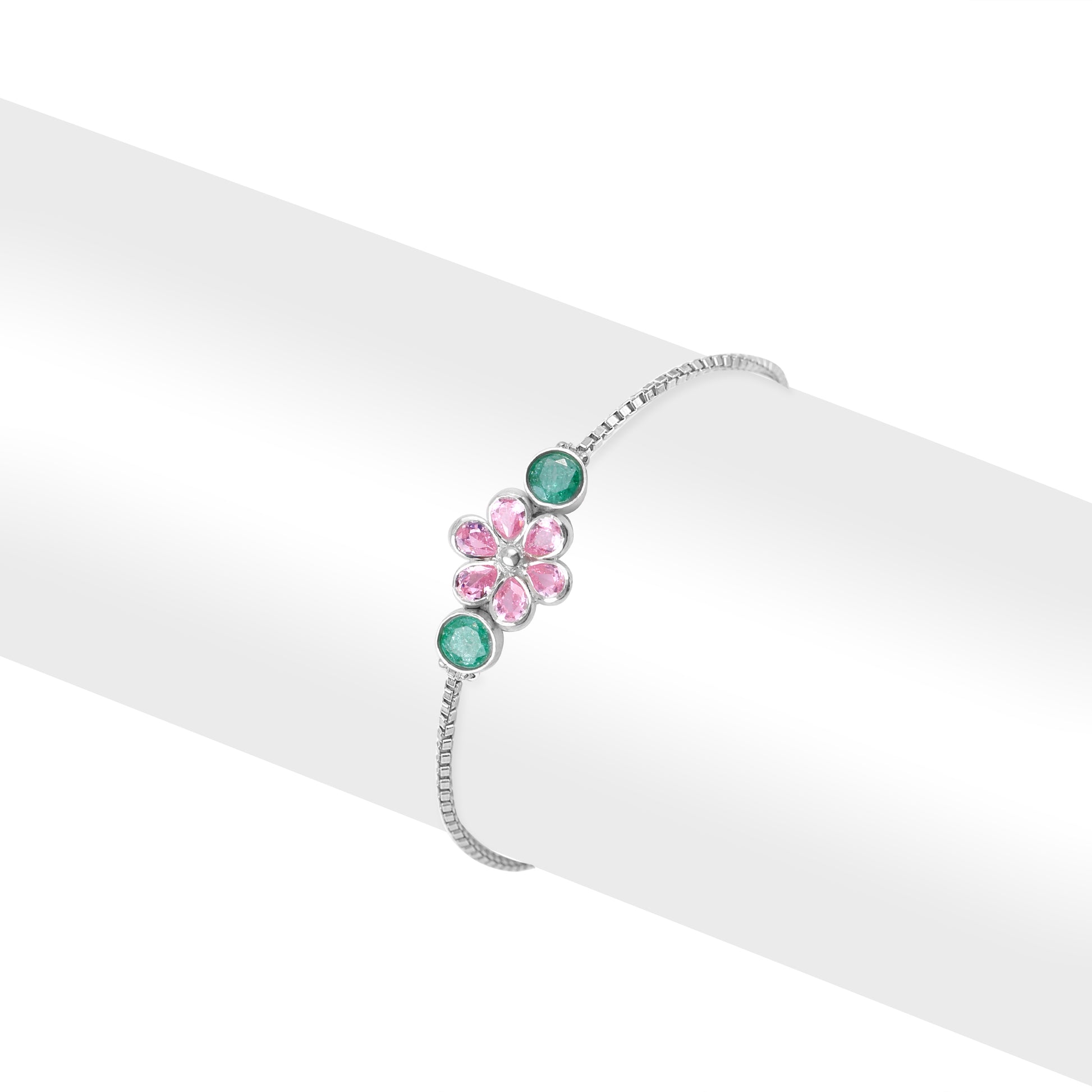 Channel soft elegance with the Floral Bliss Bracelet, a dainty piece designed to add a fresh, feminine charm to any outfit. This graceful silver bracelet features a delicate arrangement of pastel pink and aqua blue stones, forming a subtle floral motif that radiates beauty and serenity. Lightweight and comfortable, it’s perfect for all day wear whether you're dressing up for a special event or adding a hint of sparkle to your everyday look.