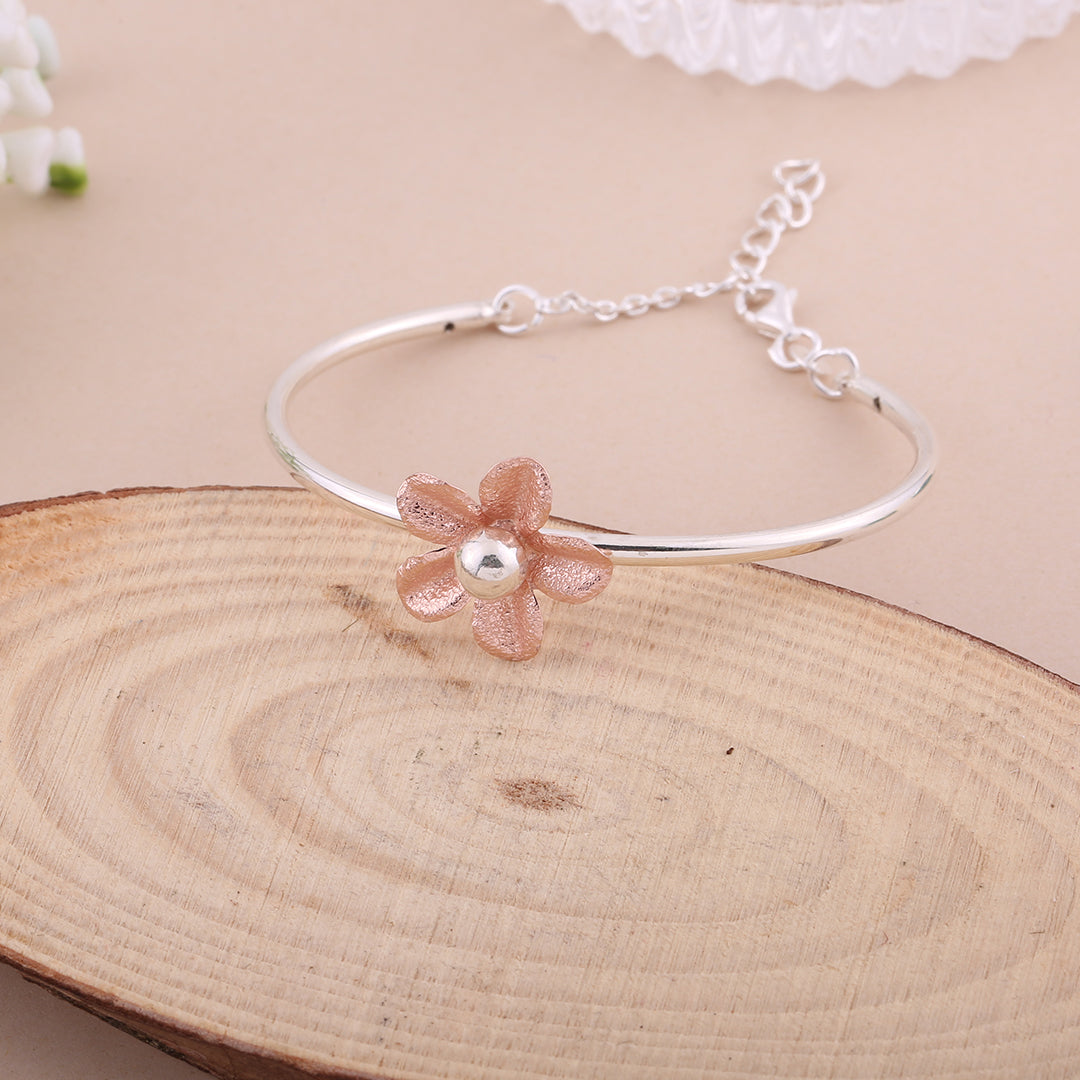 Crafted with a smooth silver base and adorned with a Rose Gold textured flower, this bracelet embodies simple sophistication and timeless charm. The central floral element adds a soft, feminine allure that makes it perfect for everyday elegance.