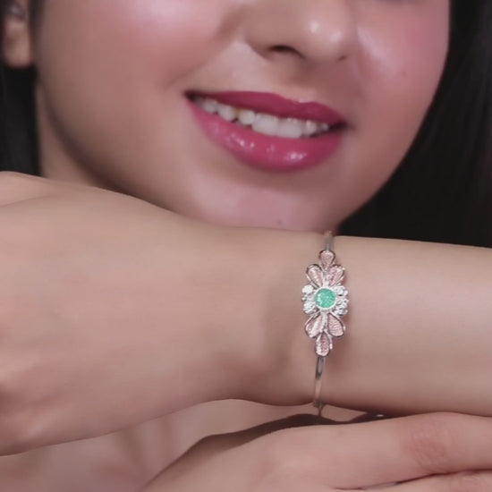 Nature Inspired details with a hint of glam. Its elegant Rose Gold petals and vibrant green centrepiece are beautifully surrounded by glimmering stones, giving it a rich, timeless appeal.