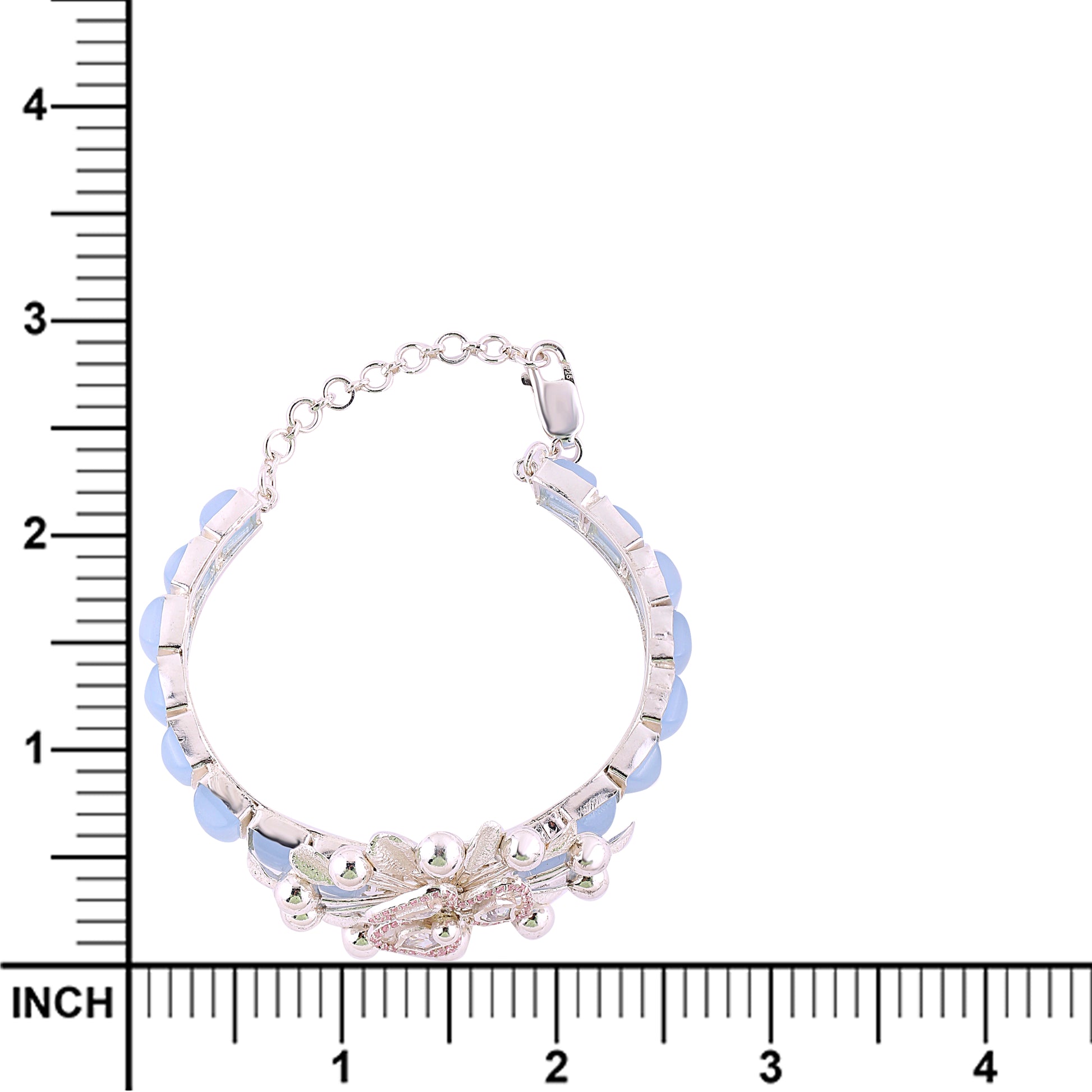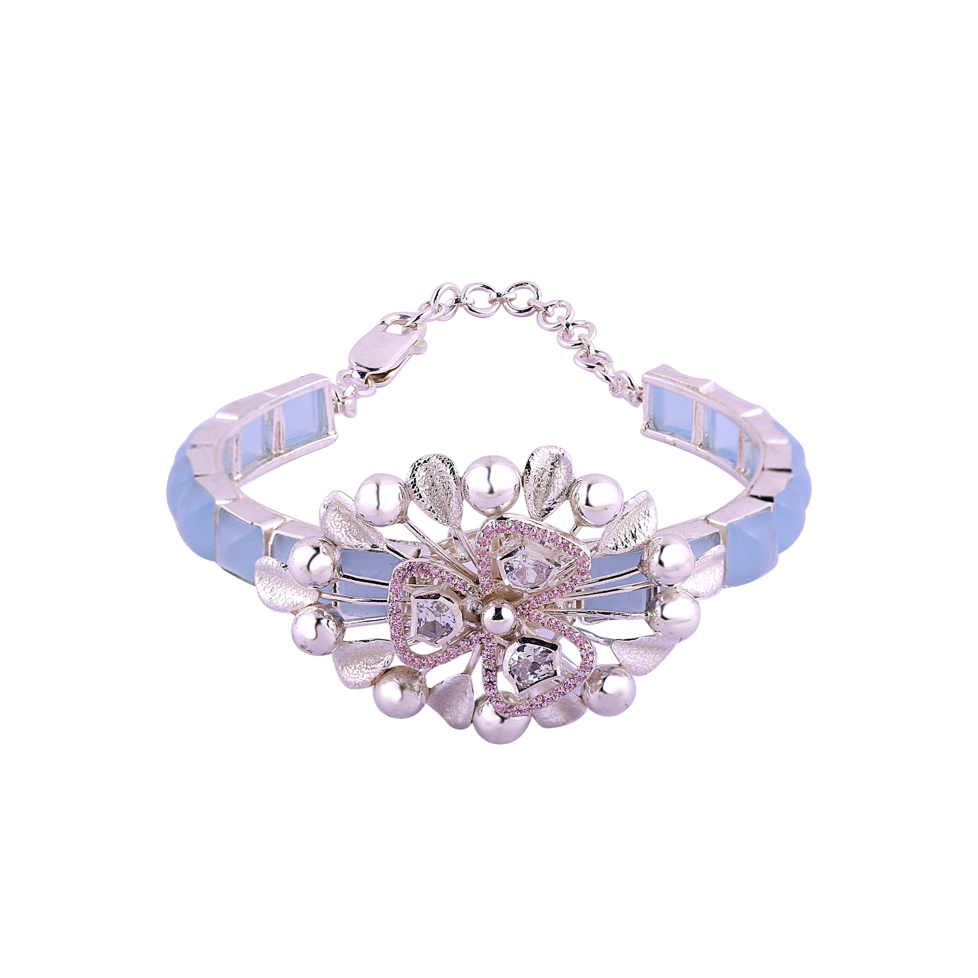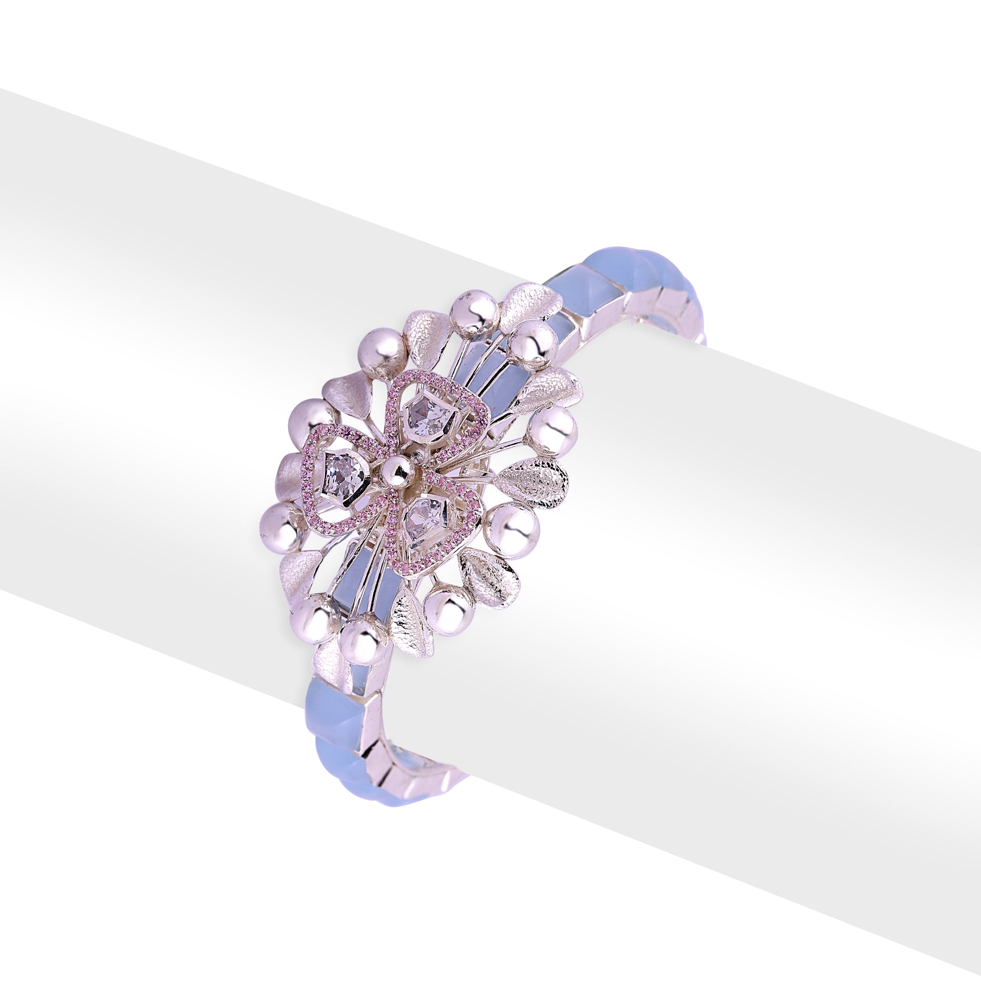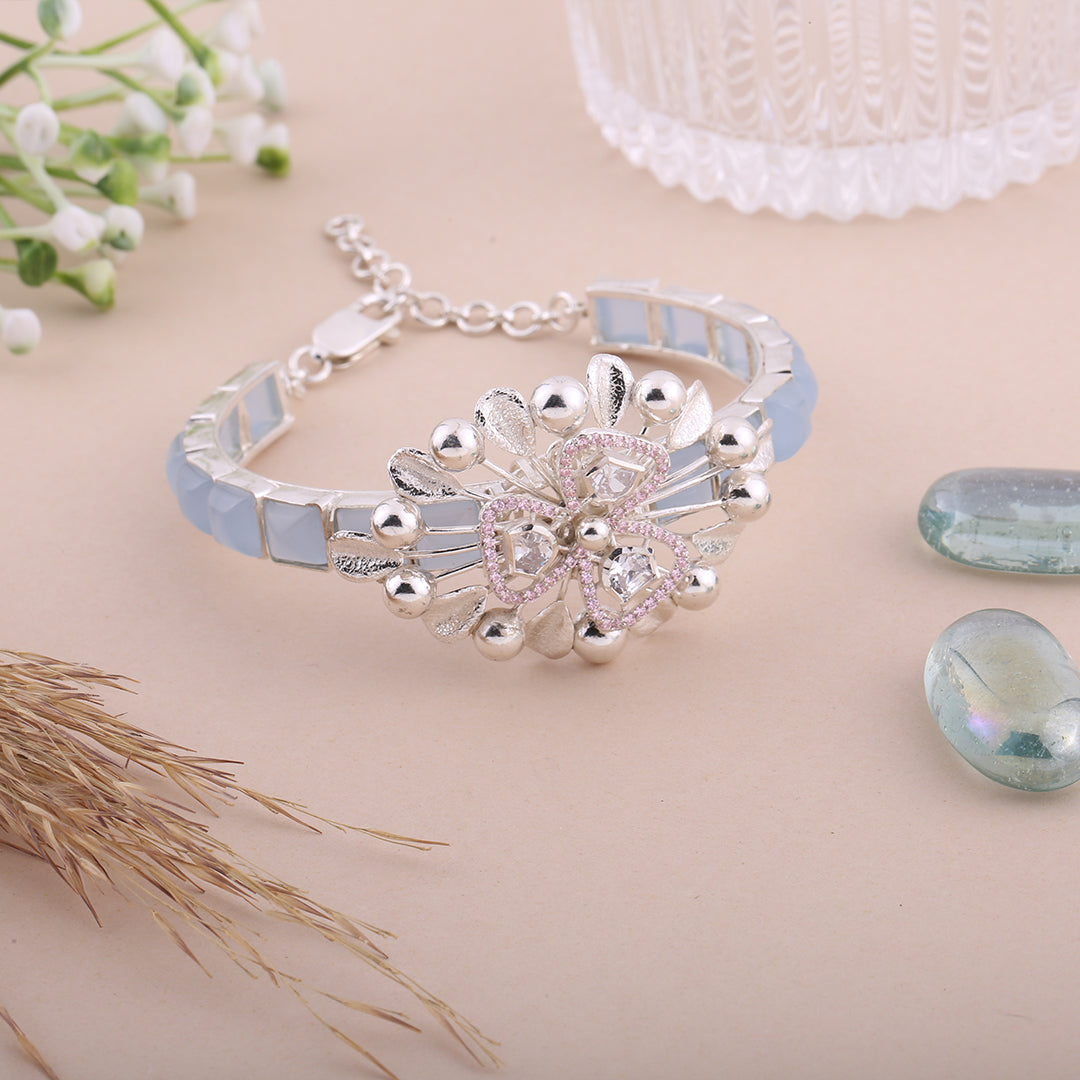 The Azure Blossom Cuff is a celebration of whimsical elegance and handcrafted finesse. Adorned with delicate petals in Serene Sky Blue and Soft Blush Pink, each Bloom is Meticulously Placed to Mimic a Flourishing Garden Kissed by Morning Dew. Set against a Lustrous Silver Toned Band, the Design exudes a Romantic Charm that feels both Ethereal & Contemporary.