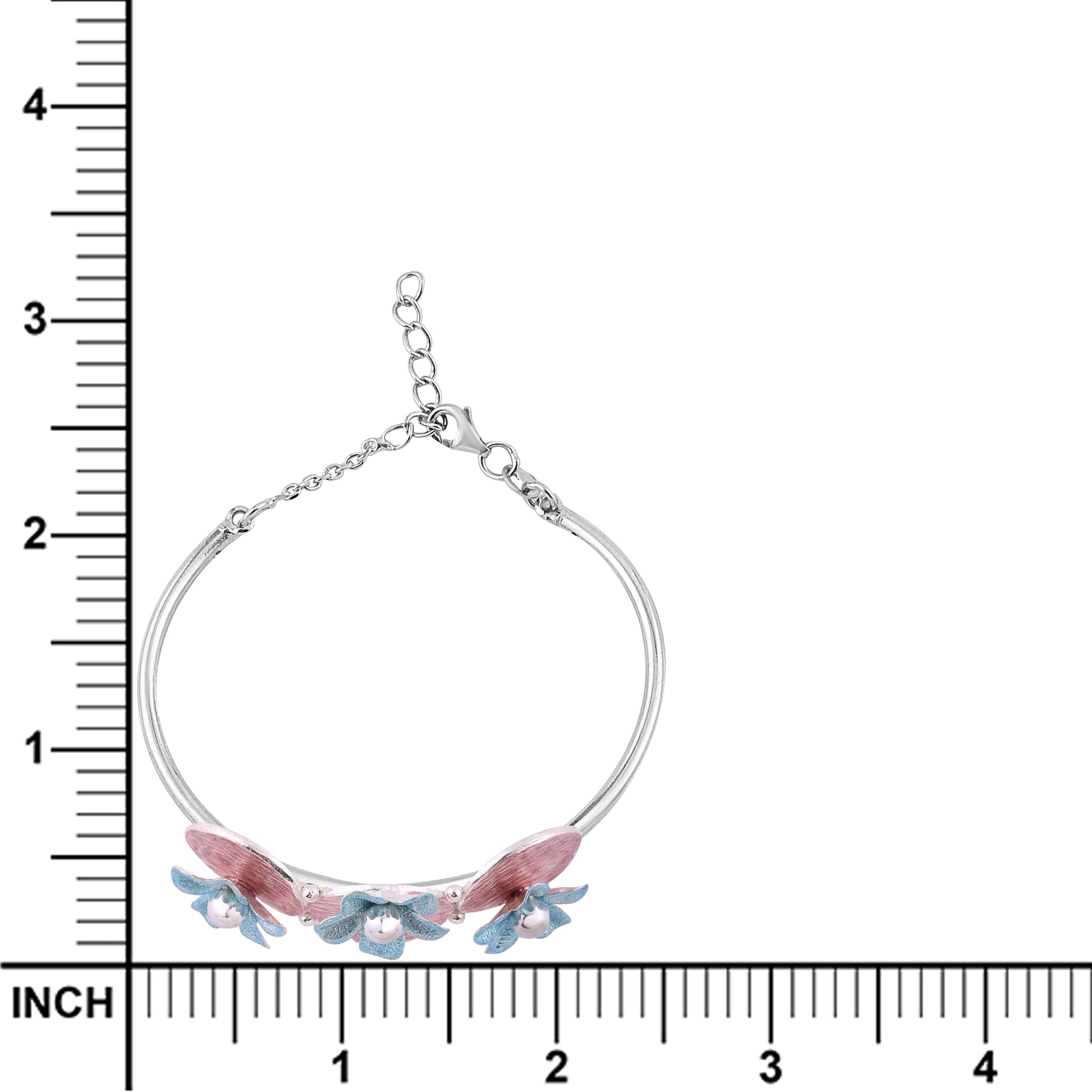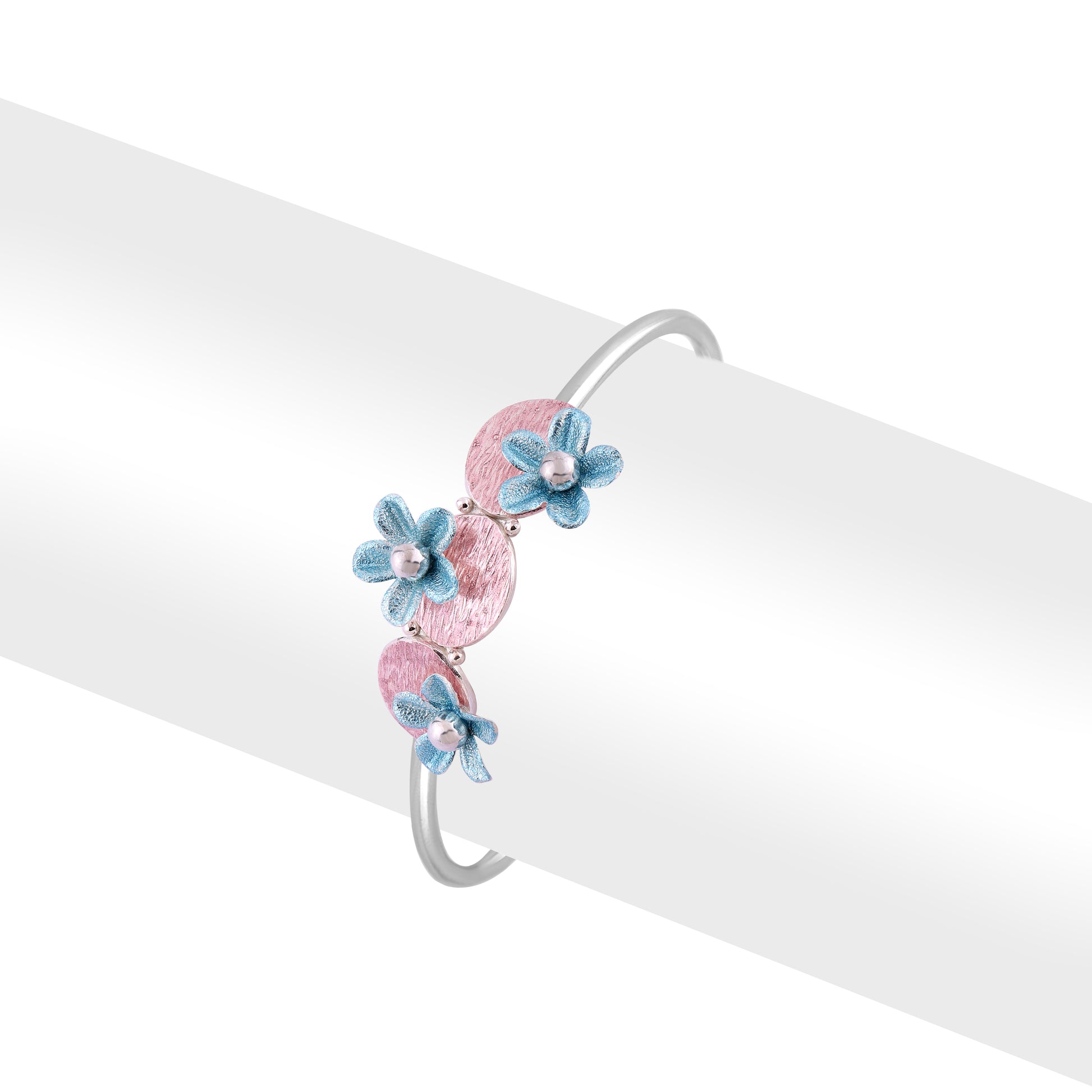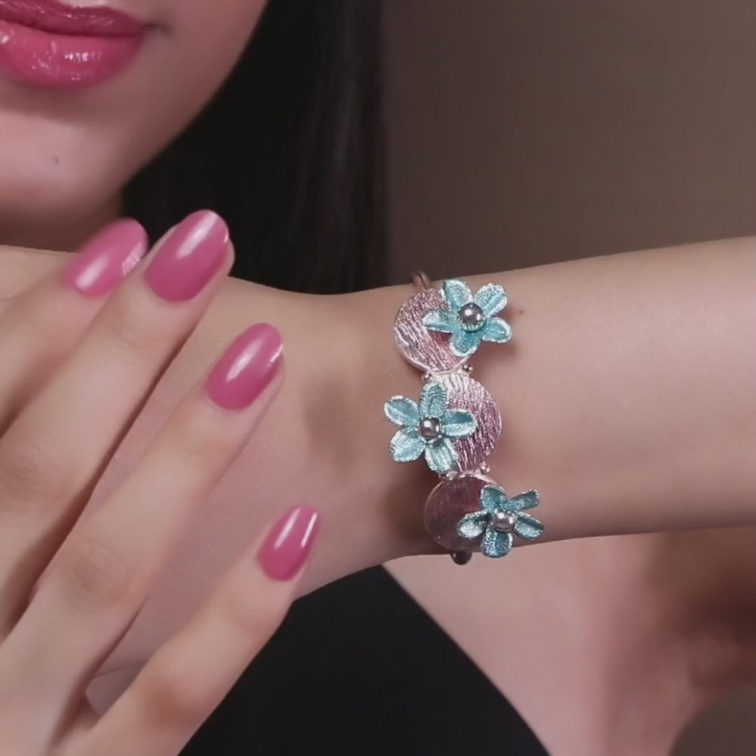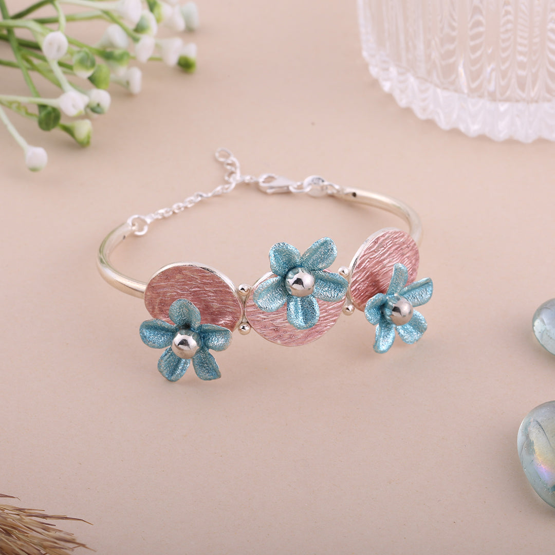 A Poetic Composition of Texture & Tone, This Bracelet Features Rose Brushed Discs Crowned With Three Radiant Blue Floral Motifs. It Fuses Modern Design With Whimsical Artistry Perfect For Those Who Appreciate Bold Feminine Energy.