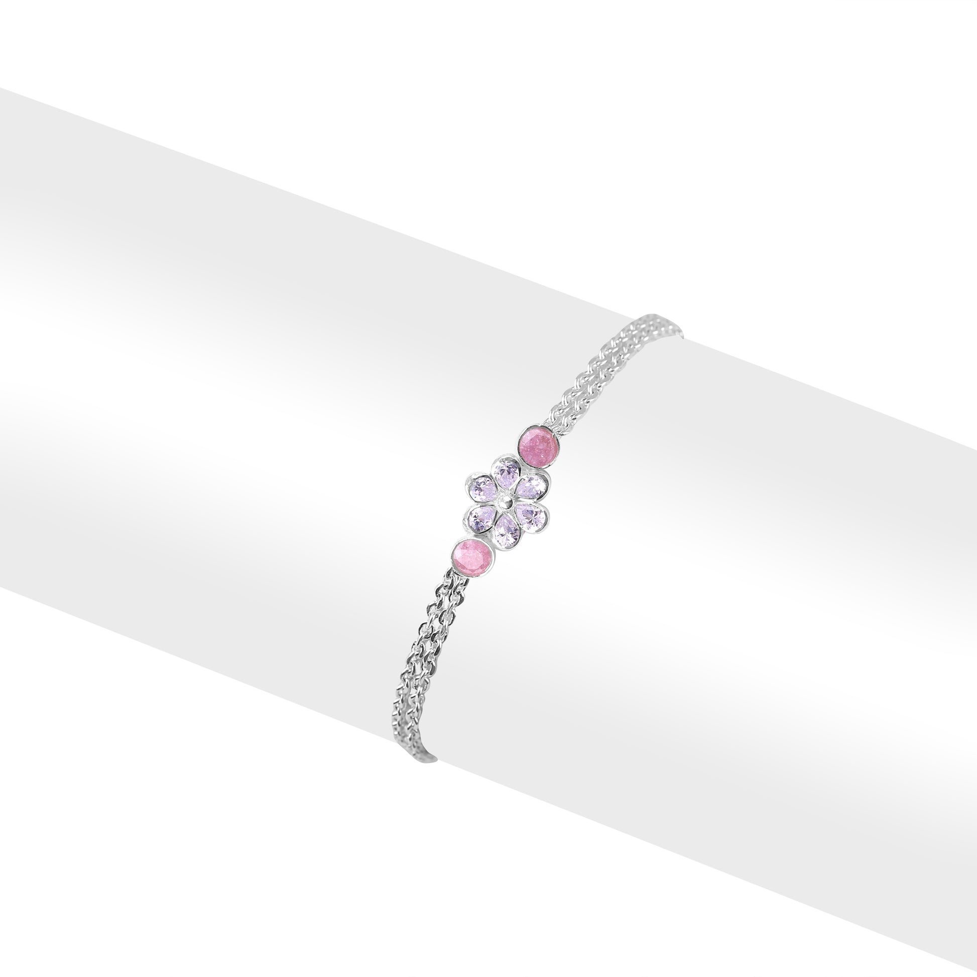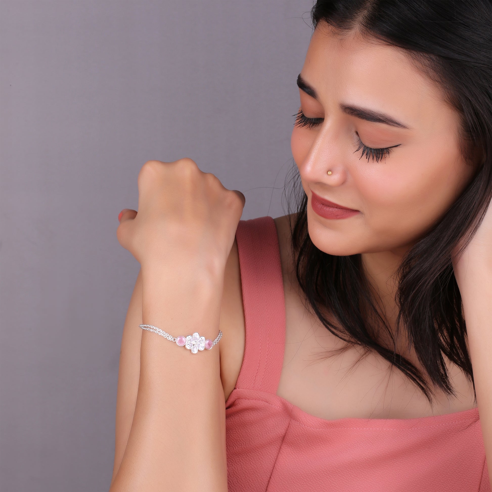 Delicately Crafted To Resemble a Blooming Flower, The Blush Bloom Crystal Bracelet Combines Pink Stones With Sparkling White Crystals In a Refined Floral Motif. The Dual Chain Design Adds Extra Grace & Comfort, Making It An Ideal Piece For Both Everyday Wear & Special Occasions.